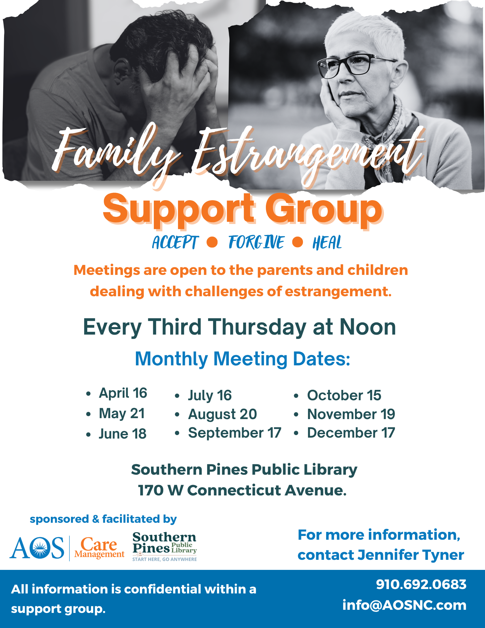 Join AOS Lead Care Manager Jennifer Tyner, every Third Thursday monthly, at 12 p.m. at the Southern Pines Public Library for FAMILY ESTRANGEMENT: A Journey of Acknowledgement.